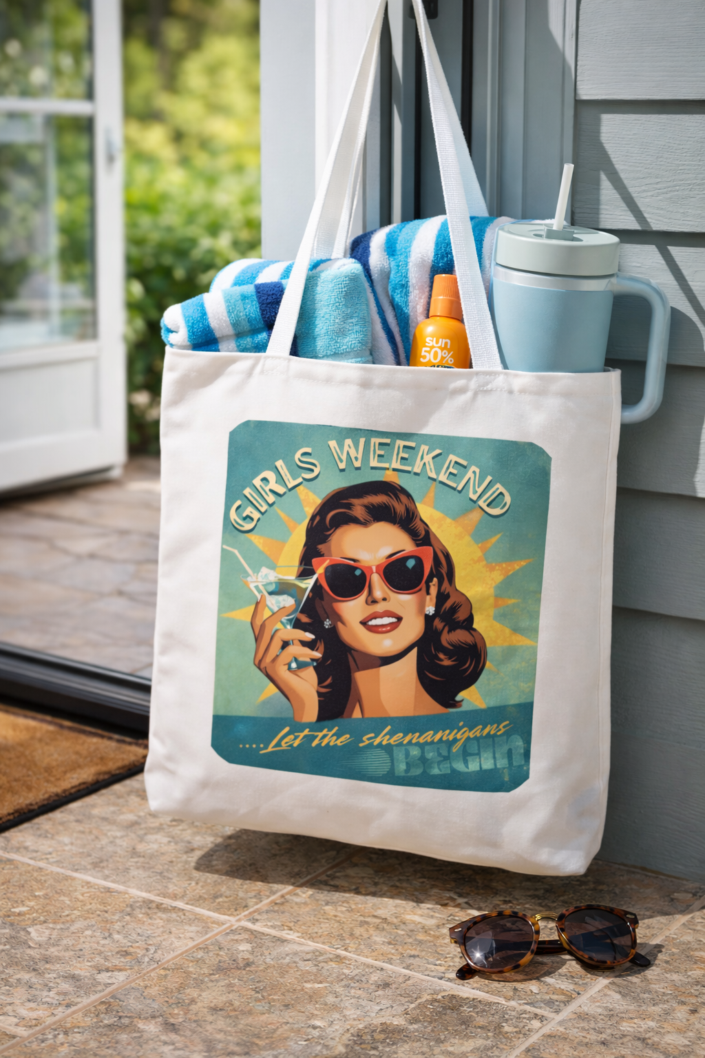 Sunshine, laughter, and zero responsibilities — this lightweight cotton shoulder tote was made for girls weekend energy. Featuring a retro pin-up–inspired “Girls Weekend” graphic, this design channels vintage road trips, oversized sunglasses, inside jokes, and the kind of memories that only happen when the group chat finally becomes real life.