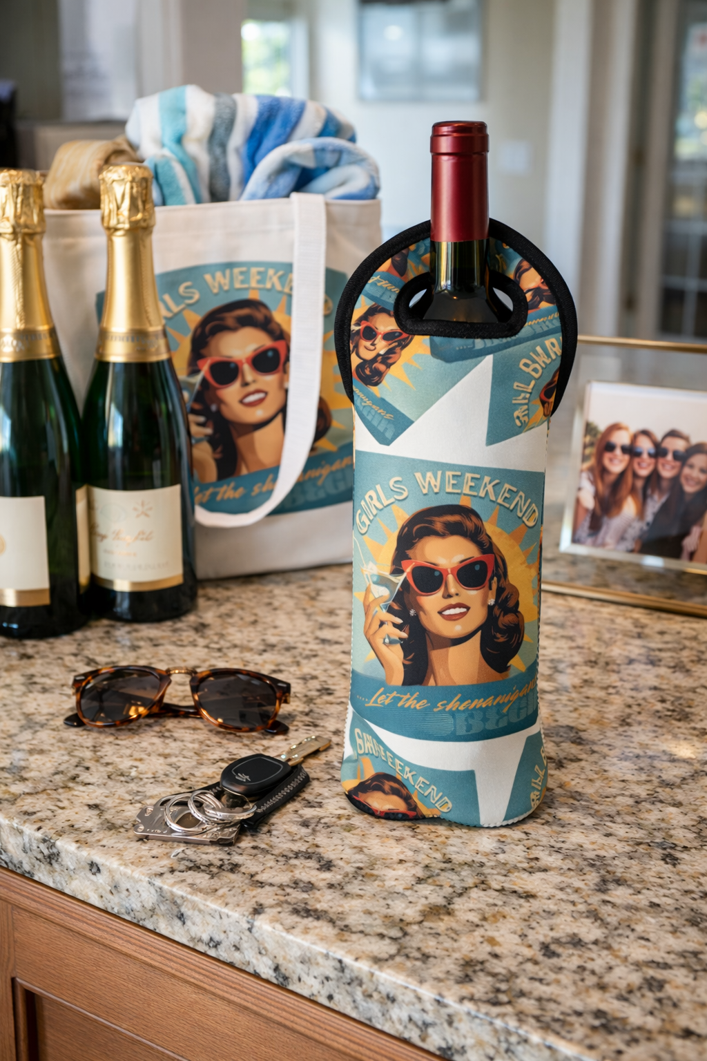 Because showing up empty-handed simply isn’t in the itinerary. This lively neoprene wine tote is designed for spontaneous getaways, beach house afternoons, and laughter-filled girls weekends. Featuring an all-over retro pin-up inspired print, it turns an everyday bottle carry into part of the celebration.